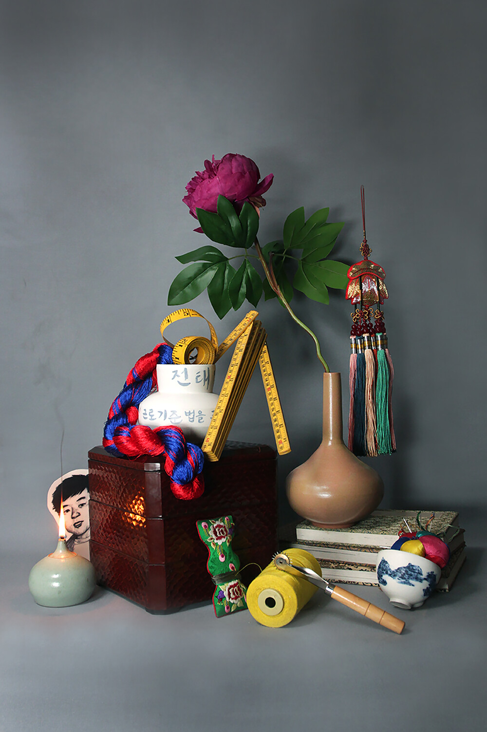 이번 전시에서 작가는 잊지 말아야 할 것들을 새기고 축적하는 방식으로 역사의 서재를 만들고 있다. 그 형식을 우리의 전통채색화인 책가도와 문자도, 책거리에서 차용하며, 책장과 서책을 중심으로 시계, 그릇, 수석, 거울, 부채 등 일상의 도구를 배치한다. 사람이라면 지켜야할 기본적인 덕목을 표현했던 문자도를 접목하고 책거리의 초현실적인 사물 배치를 참조하여 귀한 물건들을 담아 표현했던 책가도 형식으로 재현 설치한다.